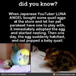 did-you-kno: When Japanese YouTuber LUNA ANGEL bought some quail eggs at the store and let her pet parakeet have one to play with, it immediately adopted the egg and started nesting. Then one day, the egg suddenly hatched, and out popped a baby quail. Source