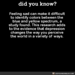 Feeling sad can make it difficult to identify colors between the blue and yellow spectrum, a study found. This research adds to the evidence that depression changes the way you perceive the world in a variety of ways. Source